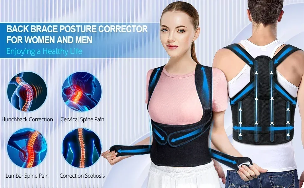 6. Improves Balance. The posture brace helps to eliminate back, shoulder, neck pain and lumbar pain, sprains and muscle spasms, improves balance and flexibility, and prevent further damage.